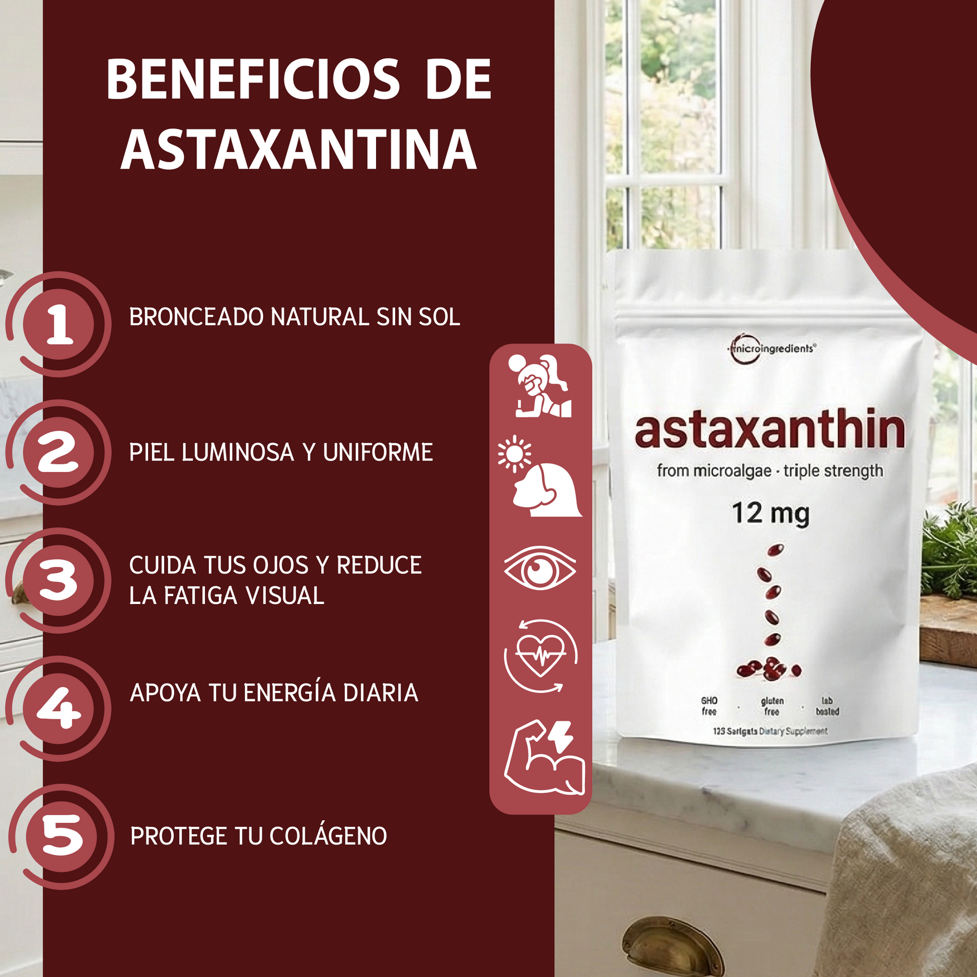 Astaxantina- Apoya la salud ocular, mejora la apariencia de la piel y potencia la energía celular.